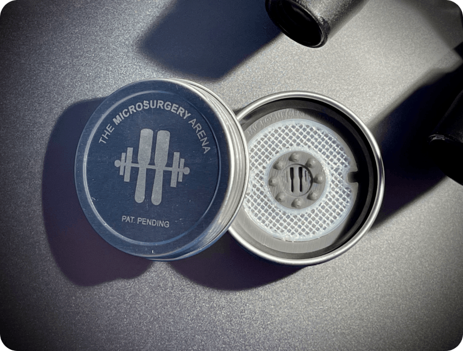 - Microsurgery Arena device in its metal screw cap box